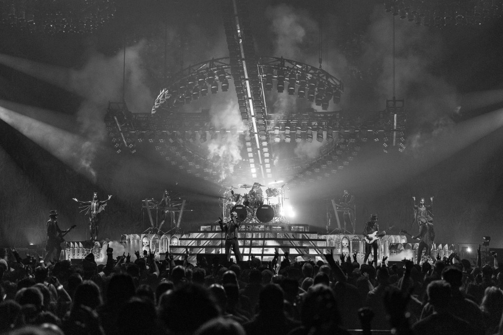 Ghost summoned…and they came. The Ritual in Peoria Civic Center roiled with anticipation as the hour approached. Slowly, the elements came together. The ritual music started…lights began to dim…incense filled the air. Ghouls around the hall came to a stand still and turned to face the stage as it went black. The Swedish rock band played with the curtain still up just for a minute before it crashed down and revealed the Skeletour stage setting and ghoul band members dressed to fit the theme, all in support of the Skeletá album. The opening song “Peacefield” played on, followed quickly by “Lachryma,” mixing old with new.